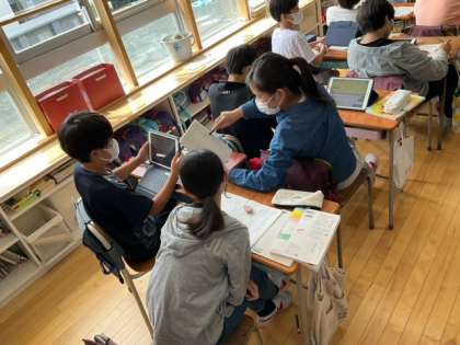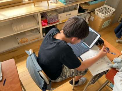 国語の時間です。5・7・5・7・7 短歌づくりに励んでいます。