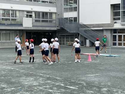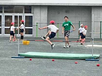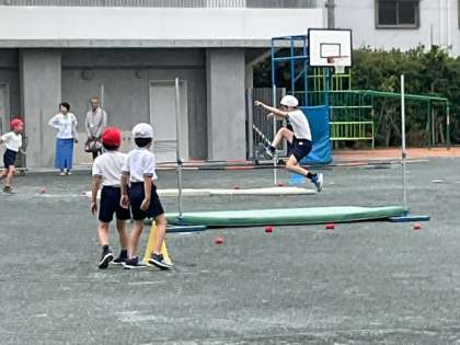 体育の時間です。走り高跳びに取り組んでいます。リズムよく走って踏み切るのは、なかなか難しい技術です。