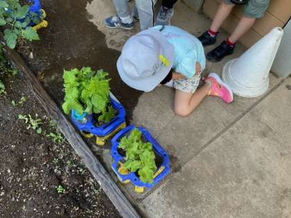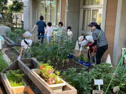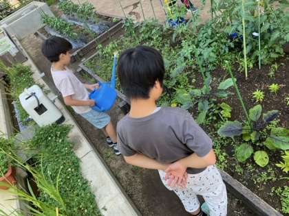 栽培活動の時間です。みんなで協力してミニトマトなどを育てています。