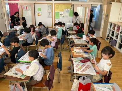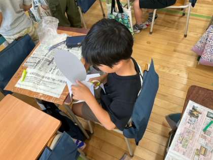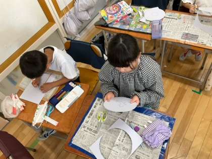 図工の時間です。工作用紙を使って、けん玉を作っています。いろいろな形のけん玉ができそうです。