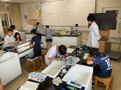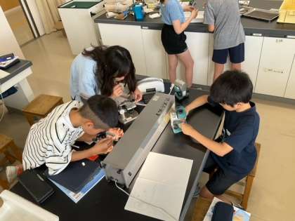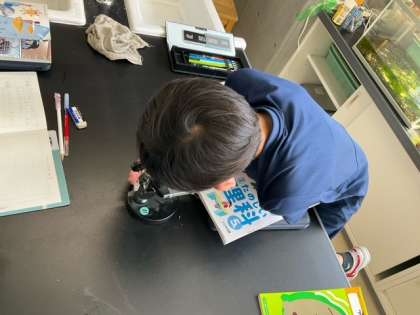 理科の時間です。メダカの卵の観察をしています。顕微鏡の扱いも上手になりました。