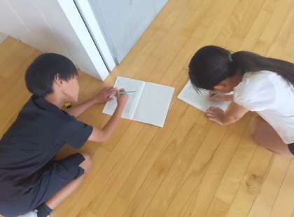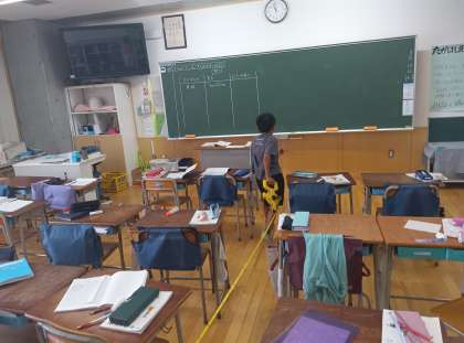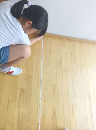算数の時間です。巻き尺ていろいろな長さを測りました。先生、「16メートルもあったよ」と驚いたように報告してくれました。