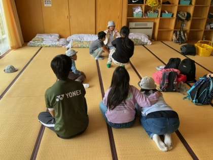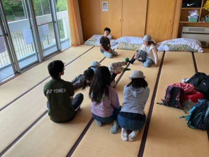 ハイキング出発前に、室内レクをしています。ジェスチャーゲームのようです。