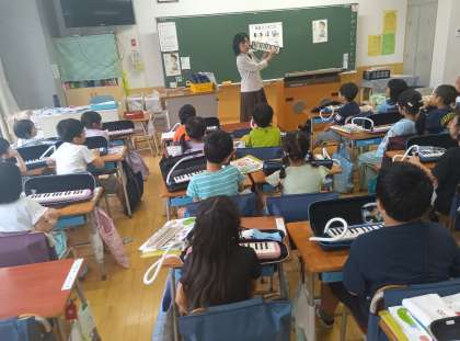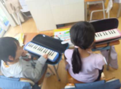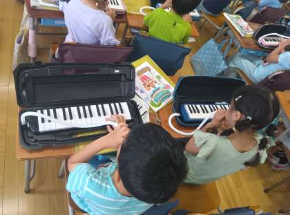 音楽の時間です。鍵盤ハーモニカの練習をしました。先生の上手な演奏にびっくりしていました。