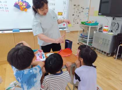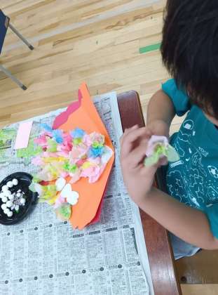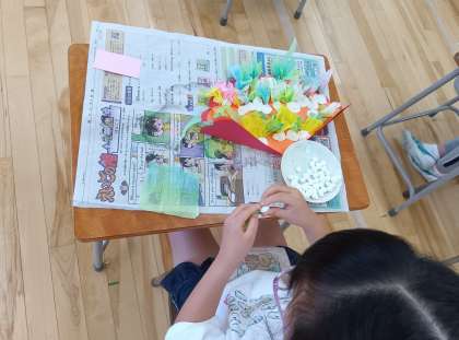 図工の時間です。花紙を使って花束を作りました。一つ一つ丁寧に心を込めました。