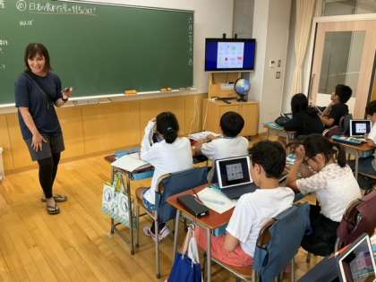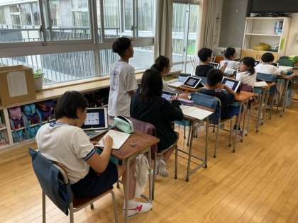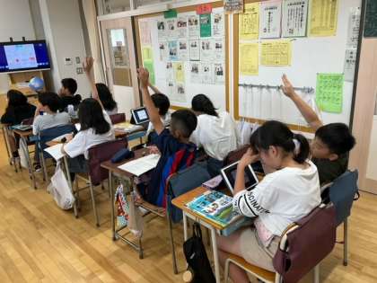 社会科の時間です。グラフやデータなどから、日本の食料生産の特徴を考えています。