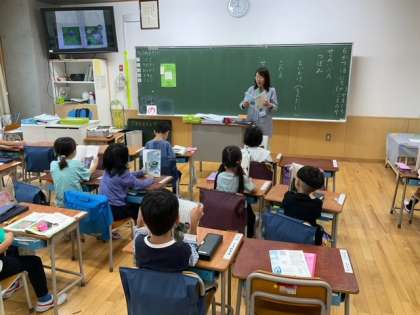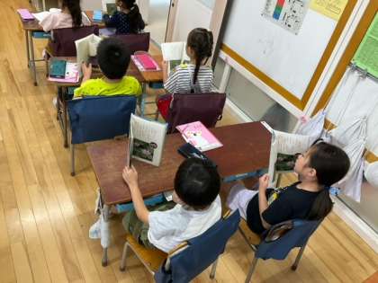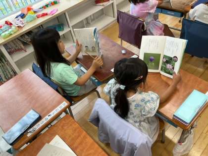 国語の時間です。「つぼみ」問いかけ、答え、説明を意識して、説明文を音読しています