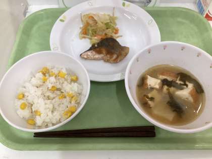 コーンご飯 魚のステーキソース お浸し 道産子汁 牛乳