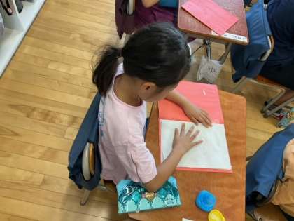 国語の時間です。「つぼみ」の学習プリントをまとめています。学習の積み重ねがよくわかりますね。