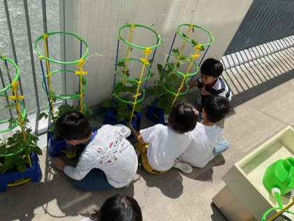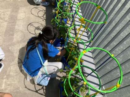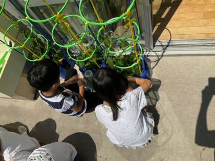 生活科の時間です。あさがおに肥料をあげています。どんどん育ってほしいですね。