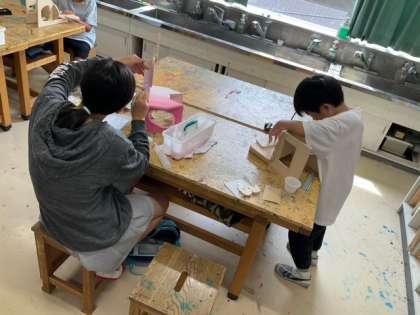 図工の時間です。「一枚の板から」いい作品に仕上がってきました。ていねいに模様を書き込んでいます。