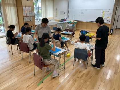 グループ学習「図工」の時間です。粘土をヘラでこそいで、造形あそびを楽しんでいます。