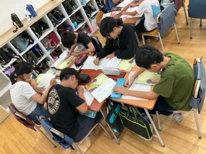 国語の時間です。「帰り道」律の心情が分かる箇所を、友達と話し合いながら書き出しています。