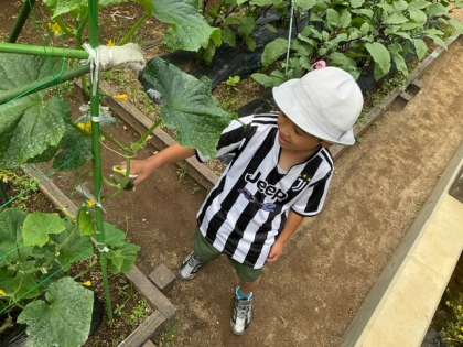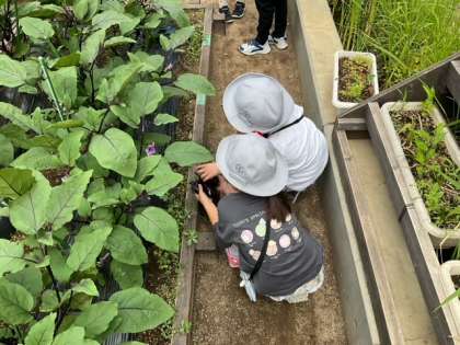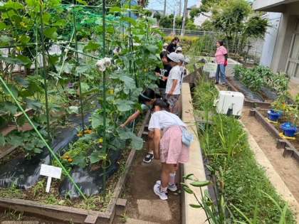 2年生が、ナス、きゅうり、ピーマンを収穫しています。立派に育っていますね。