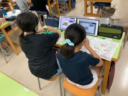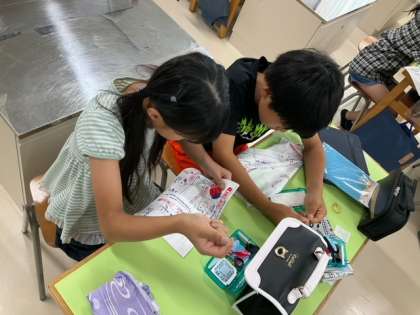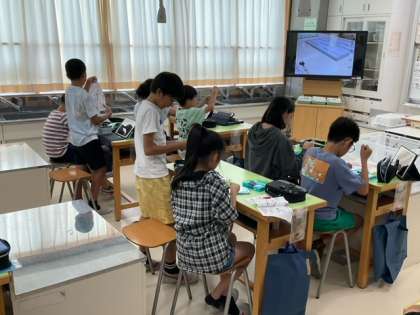 家庭科の時間です。「ひと針に心を込めて」裁縫に挑戦しています。まずは、玉止め・玉結びです。