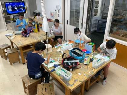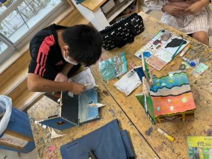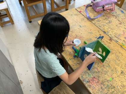 図工の時間です。「一枚の板から」ツヤ出しにニスを塗ったら完成です。どの作品もすてきです。