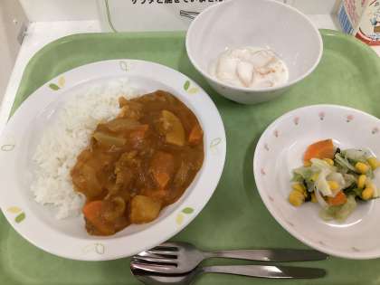 カレーライス コーンサラダ 果物のヨーグルトかけ 牛乳