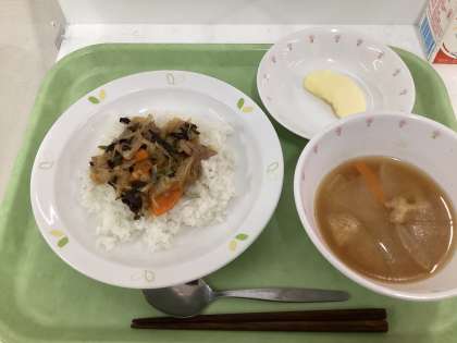 切干大根のスタミナ丼 呉汁 りんご 牛乳