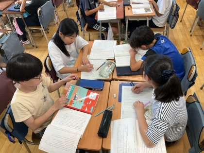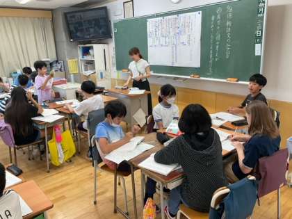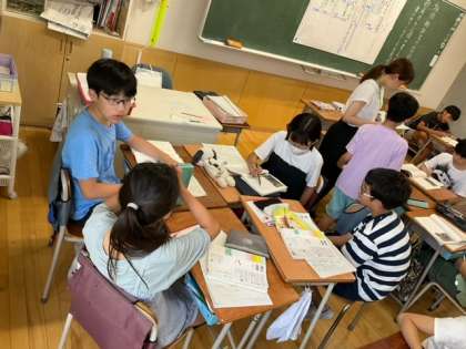 国語の時間です。「帰り道」登場人物の心情や考えが書かれているところを、グループで話し合ってまとめています。