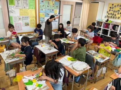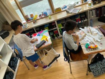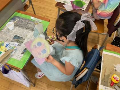 図工の時間です。「光サンドイッチ」ネオセロハンでお気に入りの色を作っています。