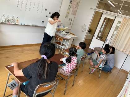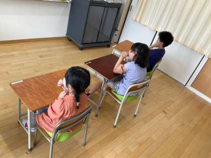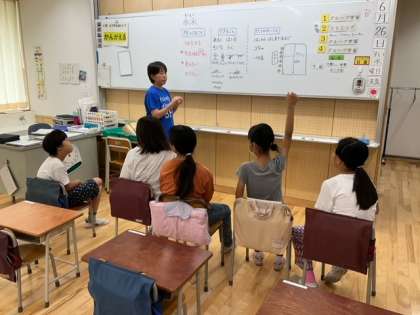 グループ学習の時間です。5年生は、水泳での自分の目標を達成できるように、泳ぎ方の学習をしています。
