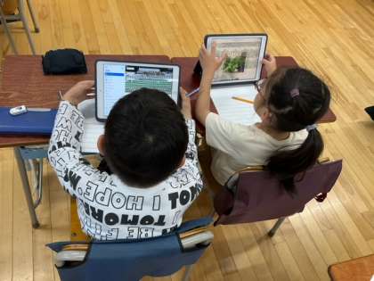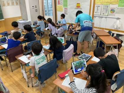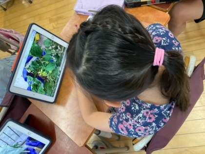 生活科の時間です。「ミニトマトのかんさつ」花が咲きました。色や形、大きさなどに着目して観察カードに記録しています。