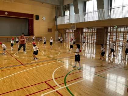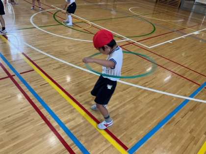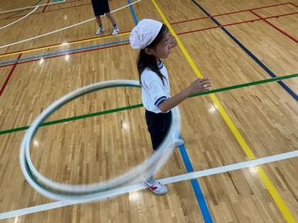 体育の時間です。フラフープに挑戦しています。「ずっと回せるようになったよ!」