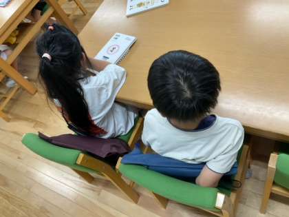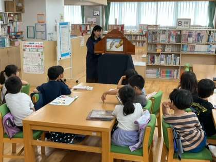 読書の時間です。「ブレーメンの音楽隊」の紙芝居です。わくわくしますね。