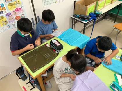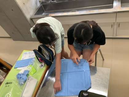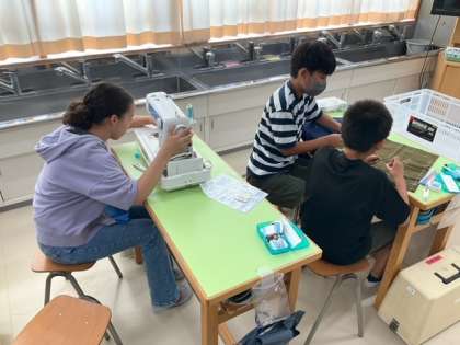 家庭科の時間です。ナップサックづくりが進行中です。一つ一つていねいに。