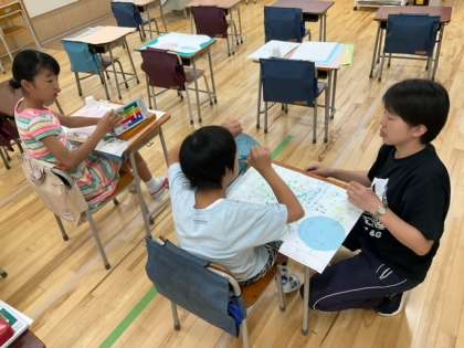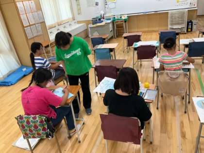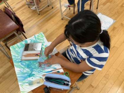 5・6年生の図工の時間です。雨の日の絵を仕上げています。ワンポイントのアクセントが生きています。