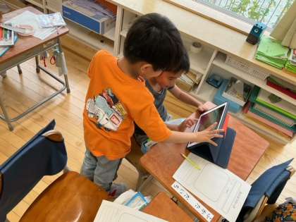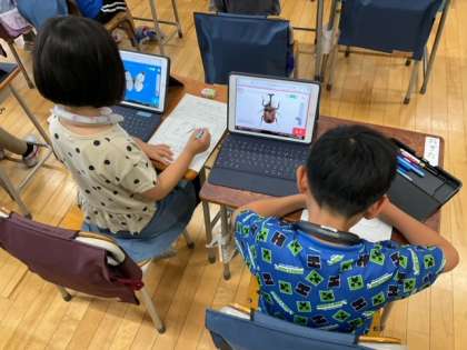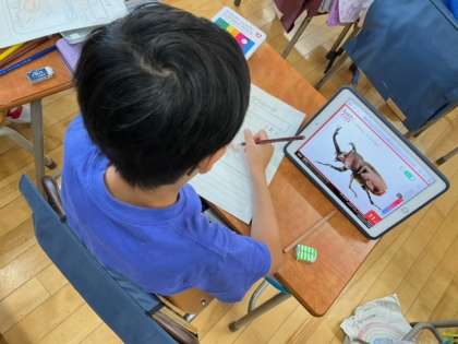 生活科の時間です。iPadを活用して、夏の生き物を調べています。拡大したり、向きを変えたりしながら、工夫して観察カードに記録しています。