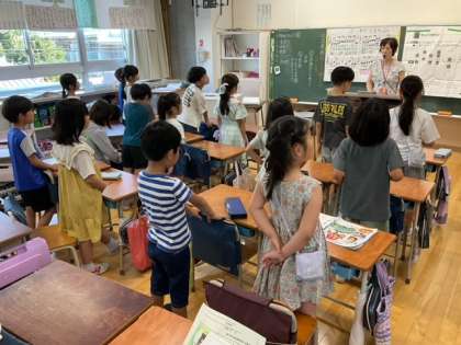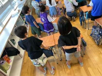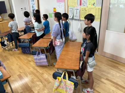 音楽の時間です。たっぷり発生練習をした後、元気に校歌を歌っています。