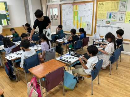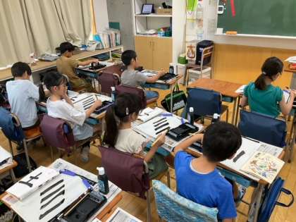 習字の時間です。筆使いに気をつけて、「たて画」を書く練習をしています。