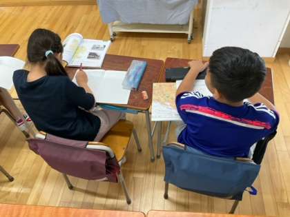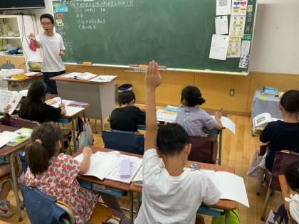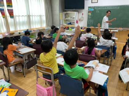 社会科の時間です。世田谷区の様子について、交通や公共機関、土地利用などの視点で調べてきました。分かったことを発表しています。