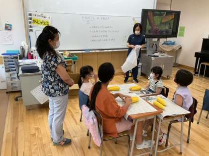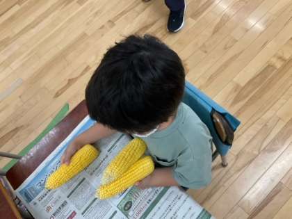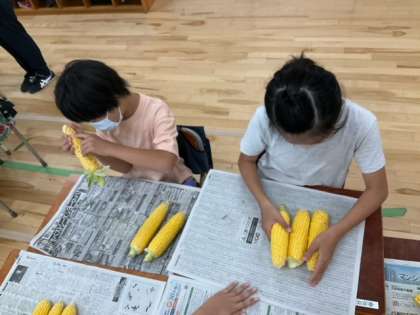 生活単元の時間です。くるみ学級のみなさんも、とうもろこしの皮むきに挑戦しています。とても上手にむけました。