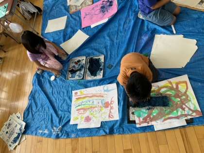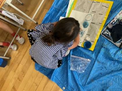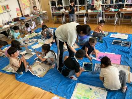 図工の時間です。「すたんぷ すたんぷ」身近なものの形を生かして、ペタペタとスランプしています。