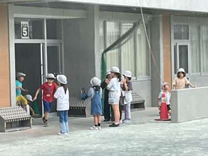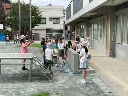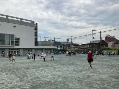 今日も、くもり空。熱中症指数も低めです。下北沢小学校では、校庭にミストシャワーを2箇所設置しています。