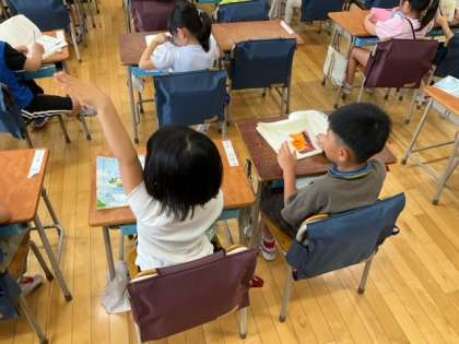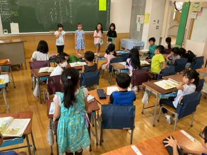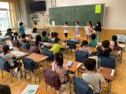 国語の時間です。「おむすび ころりん」の音読発表会を行っています。友達の良いところを伝えあっています。