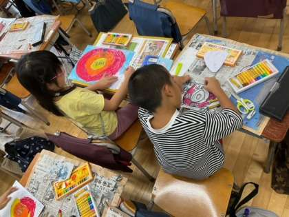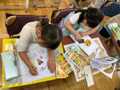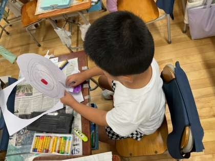 生活科の時間です。水あそびで使うための的当てを作っています。楽しみですね。