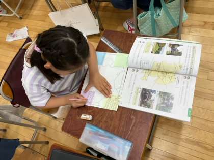 社会科の時間です。世田谷区の白地図を活用して、学習のまとめを進めています。