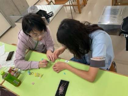 「ビーズでアクセサリー作りに挑戦」高さ5cmのクリームソーダのキーホルダーを作っています。これは、レベルが高い!