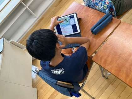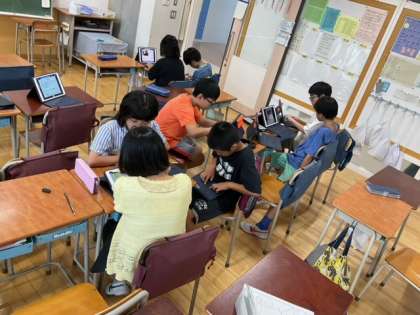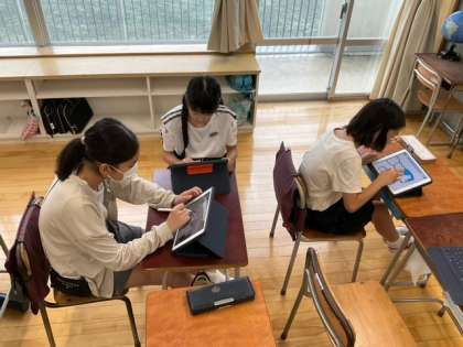 学級活動の時間です。会社(係活動)紹介カード作成中です。メンバーの写真も入れています。やる気が出ますね。
