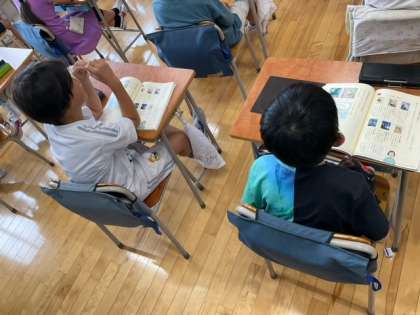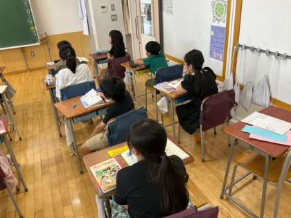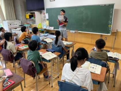 国語の時間です。「読んだ本をしょうかいし合おう」ポップや帯で、読んだ本のよさを紹介し合います。