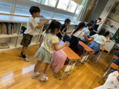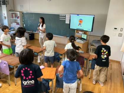 外国語活動の時間です。英語の歌に合わせて、いろいろな動きに挑戦しています。