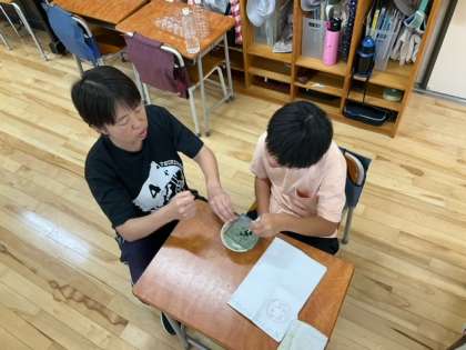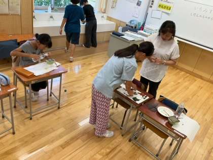 図工の時間です。おしろい花やゴーヤなどから、色水を作っています。自然ならではの色を使って、絵を描いてみます。