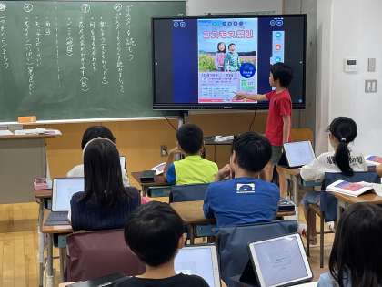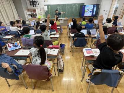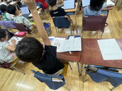 国語の時間です。実際のポスターからくふうを見付けました。自分がつくるポスターに生かしていきます。