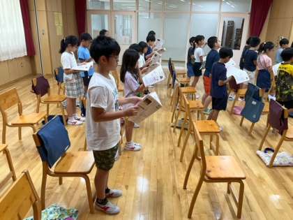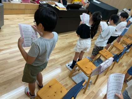 音楽の時間です。旋律の特徴に気をつけながら、「ゆかいに歩けば」を歌っています。