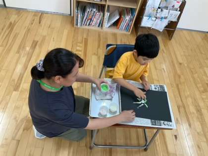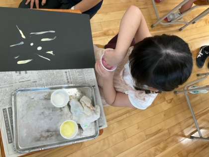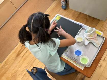 図工の時間です。筆の代わりに指を使って、花火を描いています。