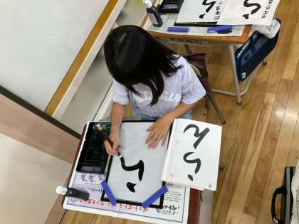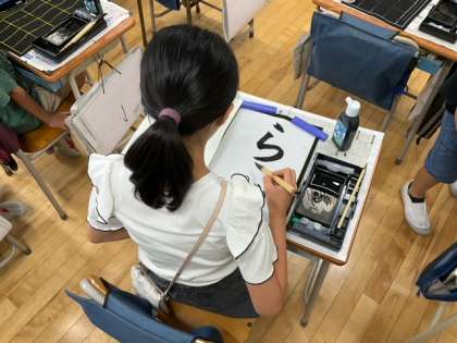 習字の時間です。今日の題字は、「らん」です。ひらがなの折れに気をつけることがポイントですね。