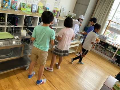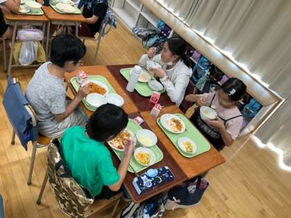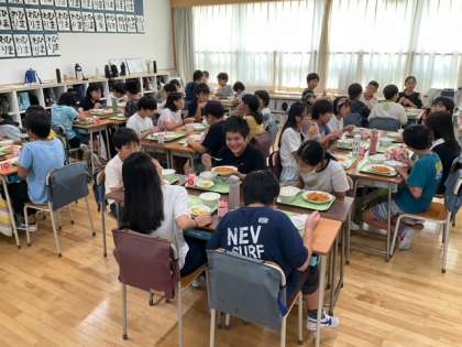 今日の献立は、ナポリタン、コーンポタージュ、ミモザサラダです。口のまわりが、すごいことになっていますよ。